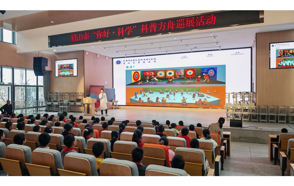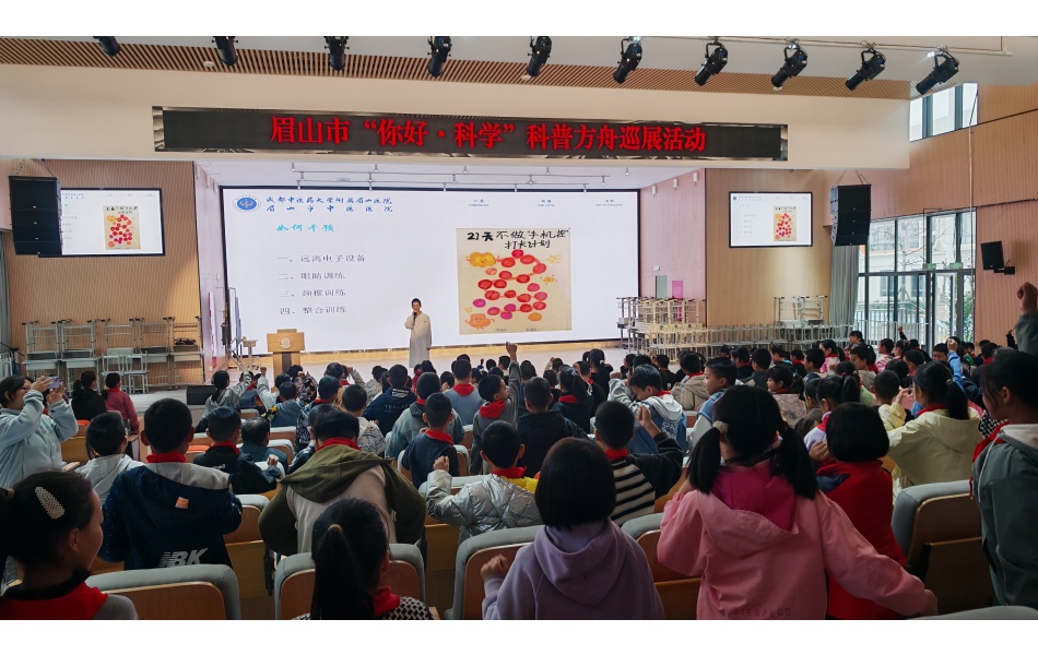 10月24日,眉山市科学技术协会主办的“你好·科学”科普方舟巡展活动在青神县滨江小学成功举办。眉山市中医医院康复医学科医生李鹏飞以“眼睛与颈椎康复”为主题,为200多名学生带来一场生动实用的健康科普讲座。