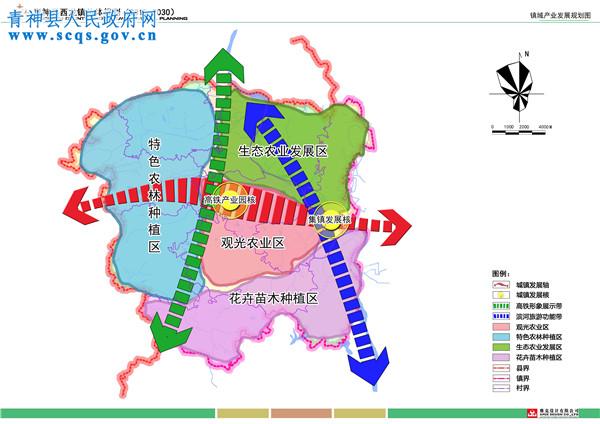 以“高铁”为依托,以特色产业为支撑,以独特风貌为亮点,集镇(高铁产业园)总体布局通过规划形成:“一带双核、两轴一环”的规划结构,一带:为高铁站到集镇的生态产业观光带;双核:为集镇综合服务功能核心,高铁产业核心;两轴:沿锦绣大道形成的城镇主要发展轴,南北向的城镇次要发展轴;一环:集镇生活环。其中集镇规划结构为“两轴一环一心三片区”,两轴一环:集镇主要发展轴线,集镇发展副轴线以及集镇内部交通环线;一心三区:综合服务中心,老场镇发展区、工业发展区、预留发展片区。高铁产业园的规划结构为:“一轴一环三片区”;一轴一环:高铁产业园主要发展轴线与高铁产业园内部交通环线;三片区:综合服务片区、教育发展片区、居住生活片区。