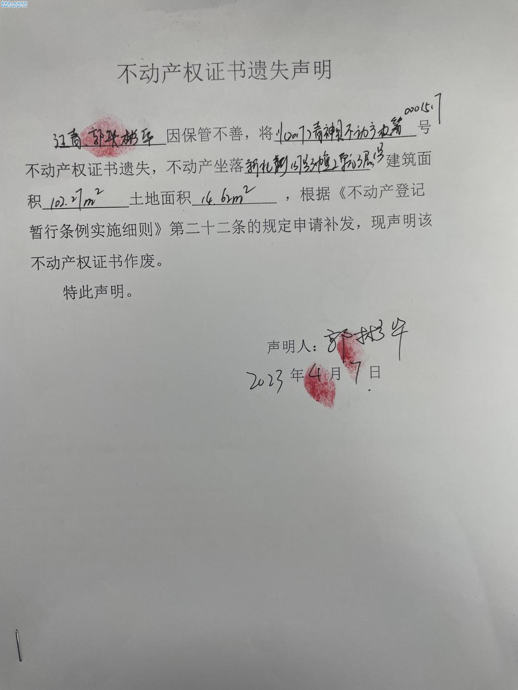 2023年4月7日不动产权证书遗失声明