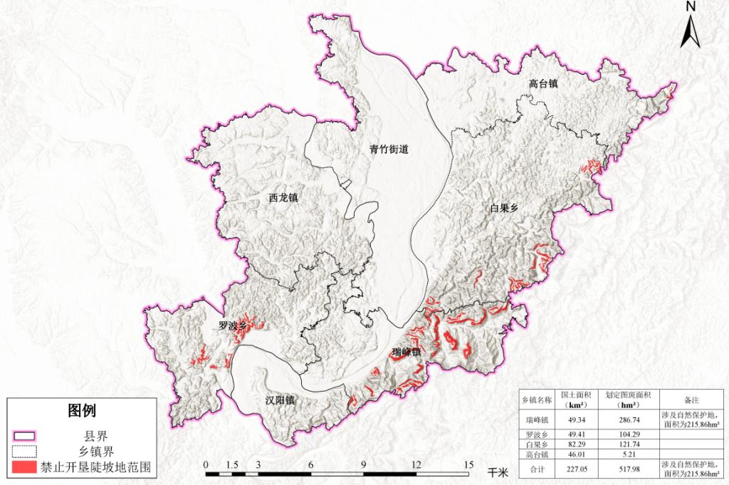 一、青神县禁止开垦陡坡地范围划定图斑47个,共涉及4个乡镇,划定总面积为517.98hm2,占全县土地总面积的1.34%,涉及自然保护地面积215.86hm2,划定图斑土地利用类型大部分为林地,少部分为草地。
