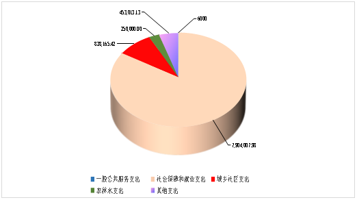 2024年度决算支出总额9441186.53元。其中:一般公共服务支出6000元,占总支出0.064%;社会保障就业支出7904007.98元,占总支出83.718%;城乡社区支出828165.42元,占总支出8.772%;农林水支出250000元,占总支出2.648%;其他支出453013.13元,占总支出4.798%。