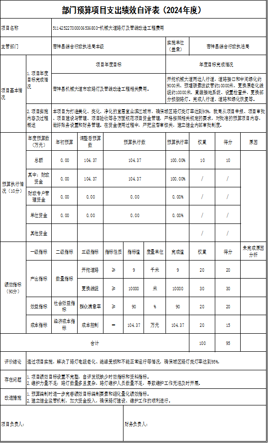 1.项目决策。该项目立项必要性和依据充分,绩效目标明确,具备实施条件,具有公共性,符合财政资金支持方向我局将进一步优化完善实施方案和绩效目标,加强运行监控,节约财政资金并提升资金效益,提升预算绩效管理水平。通过对市政路灯和照明控制箱等的巡修、巡检和应急抢修等工作,采用主动维护、预防性维护的方法,保质保量完成年度维护工作,确保市政路灯路灯安全、稳定运行。