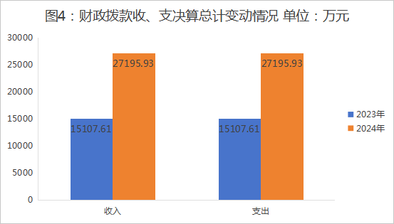 2024年度财政拨款收、支总计均为27195.93万元。与2023年度相比,财政拨款收、支总计各增加12088.32万元,增长80.01%。主要变动原因是新增农村综合性改革实验、2024年高标准农田建设(增发国债)等项目。