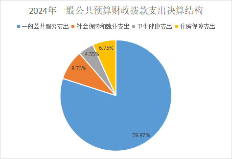 2024年度一般公共预算财政拨款支出107.27万元,主要用于以下方面:一般公共服务支出85.78万元,占79.97%;社会保障和就业支出9.37万元,占8.73%;卫生健康支出4.88万元,占4.55%;住房保障支出7.24万元,占6.75%。
