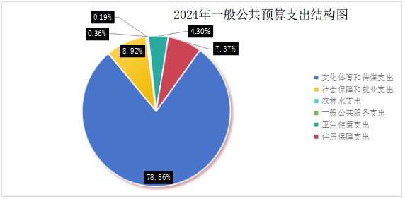 2024年度一般公共预算财政拨款支出599.52万元,主要用于以下方面:一般公共服务支出1.16万元,占0.19%;文化体育与传媒支出472.78万元,占78.86%;社会保障和就业支出53.47万元,占8.92%;卫生健康支出25.77万元,占4.30%;农林水支出2.13万元,占0.36%;住房保障支出44.21万元,占7.37%。