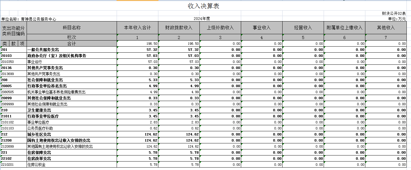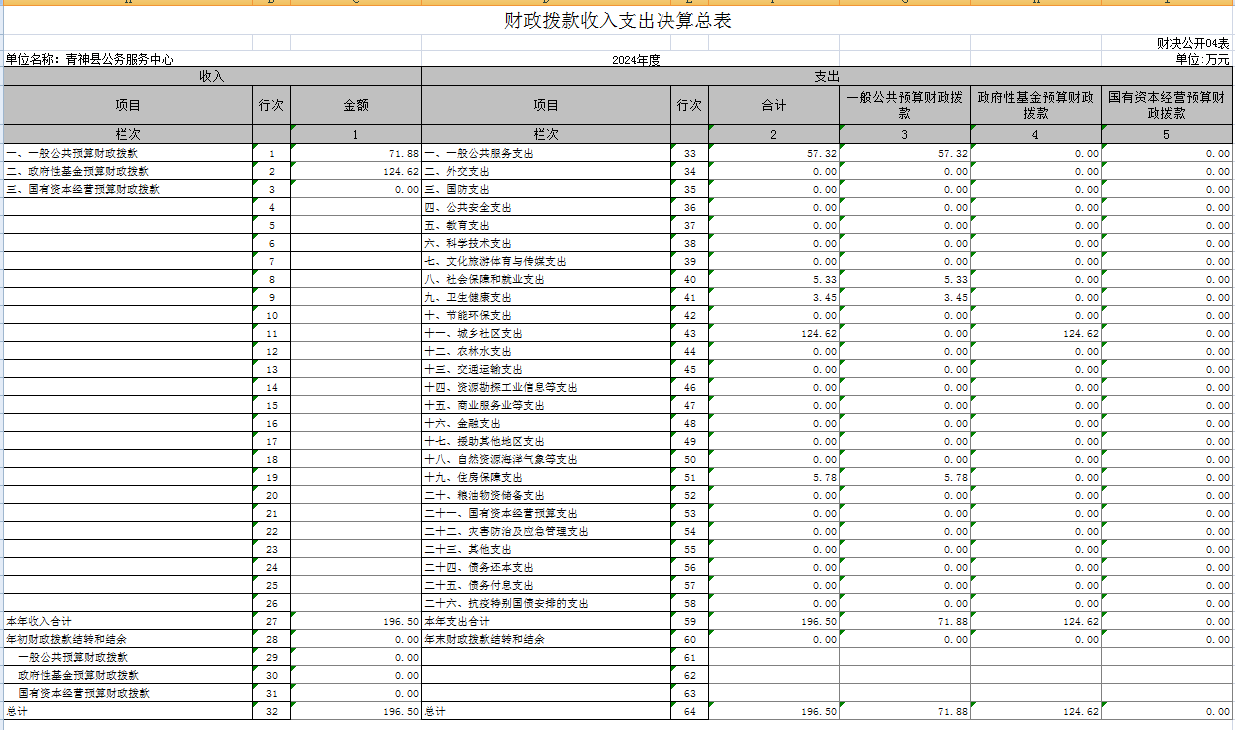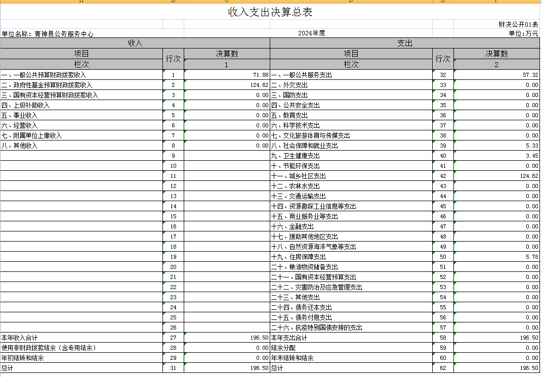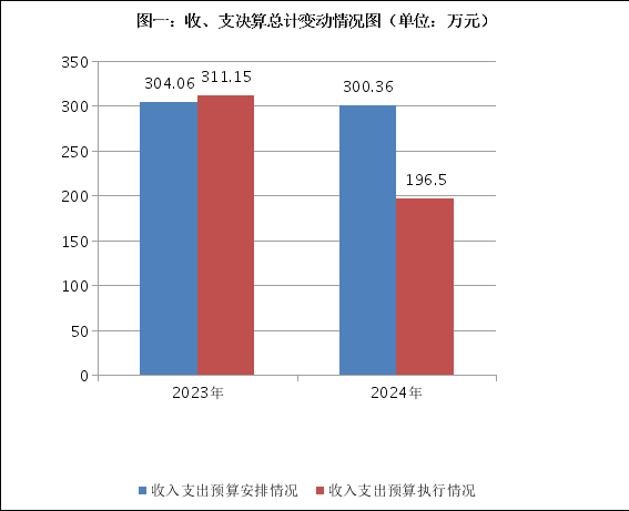 2024年度收、支总计均为196.50万元。与2023年度相比,收、支总计各减少114.66万元,减少36.85%。主要变动原因减少原因为项目工作预算安排减少。