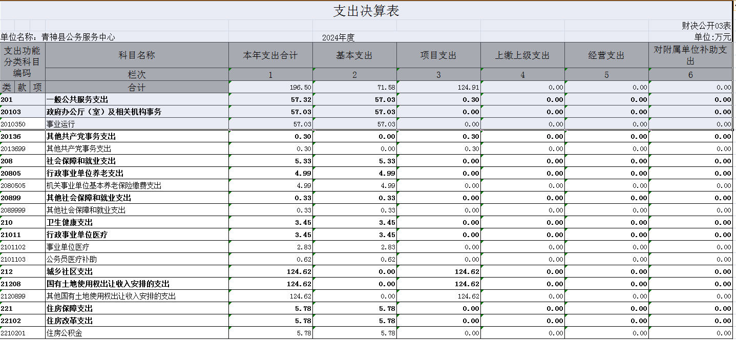 2024年度本年支出合计196.5万元,其中:基本支出71.59万元,占36.43%;项目支出124.91万元,占63.57%;上缴上级支出0万元,占0%;经营支出0万元,占0%;对附属单位补助支出0万元,占0%。