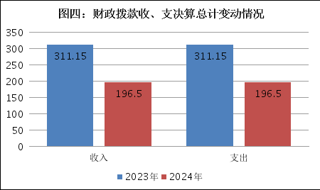 2024年度财政拨款收、支总计均为196.5万元。与2023年度相比,财政拨款收、支总计各减少114.66万元,下降36.85%。主要变动原因是项目工作预算安排减少。