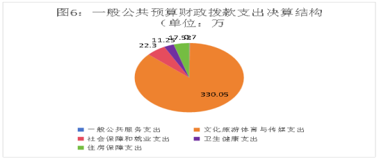 2024年度一般公共预算财政拨款支出381.83万元,主要用于以下方面:一般公共服务支出0.70万元,占0.18%;文化旅游体育与传媒支出330.05万元,占86.44%;社会保障和就业支出22.3万元,占5.84%;卫生健康支出11.25万元,占2.95%;住房保障支出17.52万元,占4.59%。