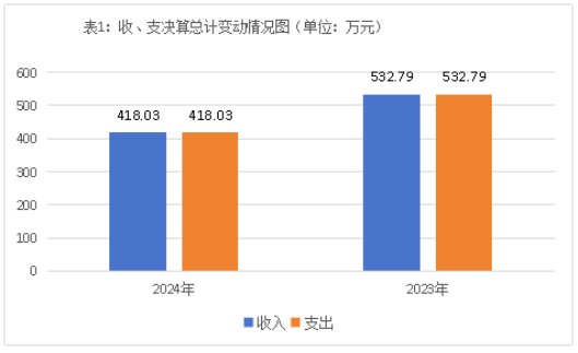 2024年度收、支总计均为418.03万元。与2023年度相比,收、支总计各减少114.76万元,下降27.45%。主要变动原因是项目推动缓慢,支出滞后。