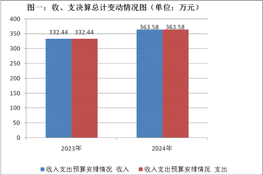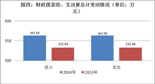 2024年度财政拨款收、支总计均为363.58万元。与2023年相比,财政拨款收、支总计各增加31.14万元,增长9.37%。主要变动原因是人员变动职业年金记实和退休人员死亡新增抚恤金支出等。