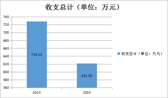 2024年度收、支总计均为621.56万元。与2023年度相比,收、支总计各减少106.56万元,减少14.63%。主要变动原因是2024年五经普工作基本结束,普查经费大幅下降。