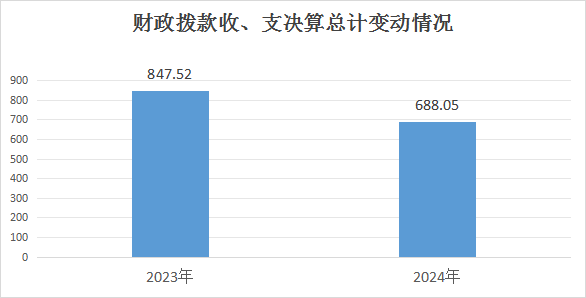 2024年度财政拨款收入、支出总计均为688.05万元。与2023年度相比,财政拨款收入总计、支出总计各减少159.47万元,下降18.82%。主要变动原因是2024年的医疗服务与保障能力提升中央补助资金及2024年实施基药补助县级配套项目剩余资金结转到2025年年初拨付。