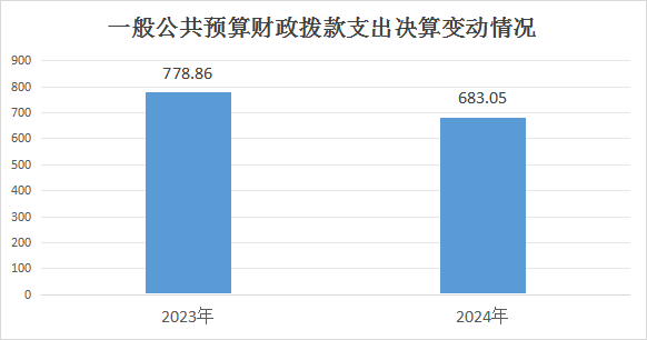 2024年度一般公共预算财政拨款支出683.05万元,占本年支出合计的4.15%。与2023年度相比,一般公共预算财政拨款支出减少95.81万元,下降12.3%。主要变动原因是2024年的医疗服务与保障能力提升中央补助资金及2024年实施基药补助县级配套项目剩余资金结转到2025年年初拨付。