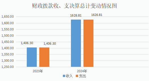 2024年度财政拨款收、支总计均为1626.81万元。与2023年度相比,财政拨款收、支总计各增加220.5万元,增长15.7%。主要变动原因是项目增加,项目经费增加。