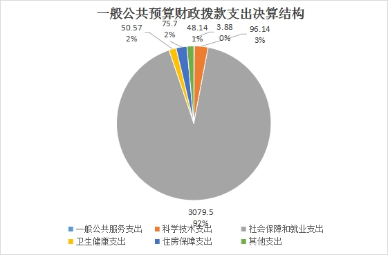 2024年度一般公共预算财政拨款支出3353.93万元,主要用于以下方面:一般公共服务支出3.88万元,占0.11%;科学技术支出96.14万元,占2.86%;社会保障和就业支出3079.5万元,占91.82%;卫生健康支出50.57万元,占1.51%;住房保障支出75.7万元,占2.26%;其他支出48.14万元;占1.44%。