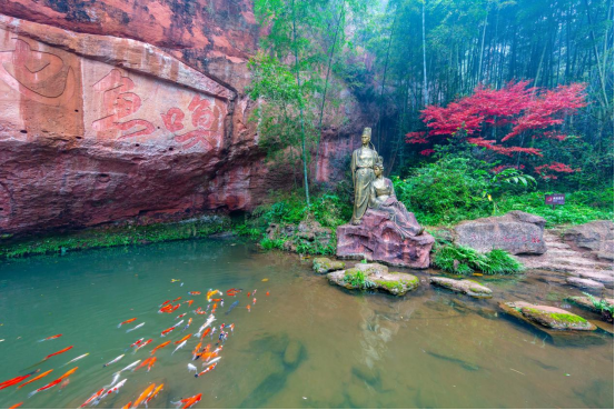 沿着苏轼少年求学的青石板路,踏入中岩寺。这里森林覆盖率高达95%以上,生态环境得天独厚,曾被范成大誉为“西川林泉最佳处”,陆游更是赞其为“川南第一山”。漫步山间,摩崖石刻在苔痕斑驳中诉说着唐宋风华,行至“唤鱼池”,掬一捧清泉,仿佛能看到东坡与王弗以鱼传情的浪漫场景。苍翠竹林掩映古寺,山涧潺潺流水相伴,每一步都像是走进了一幅水墨长卷,在自然与历史的交融中,感受心灵的宁静。
