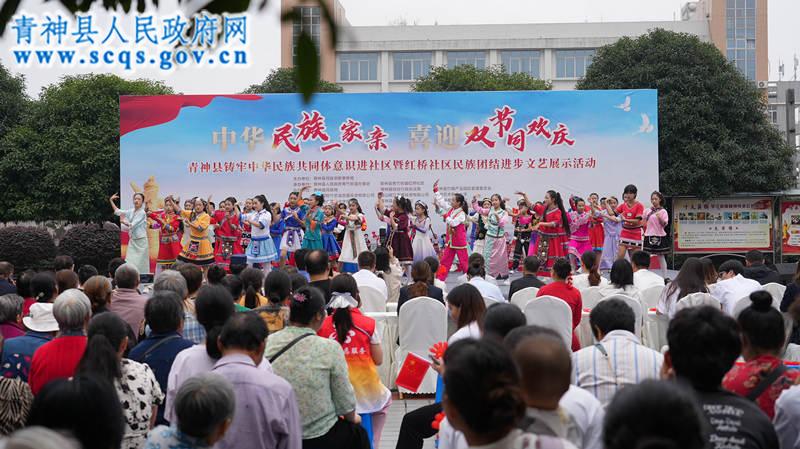 当天文艺活动表演亮点纷呈,青竹街道老年协会文艺队以一首《歌唱祖国》奏响序曲,激昂锣鼓瞬间点燃现场气氛;成都艺术职业大学的《红色娘子军》舞蹈与县初级中学带来的合唱《小美满》刚柔并济,彰显出家国情怀;青神中等职业学校带来的彝语合唱《不要怕》,用质朴旋律传递出跨越民族的精神力量……