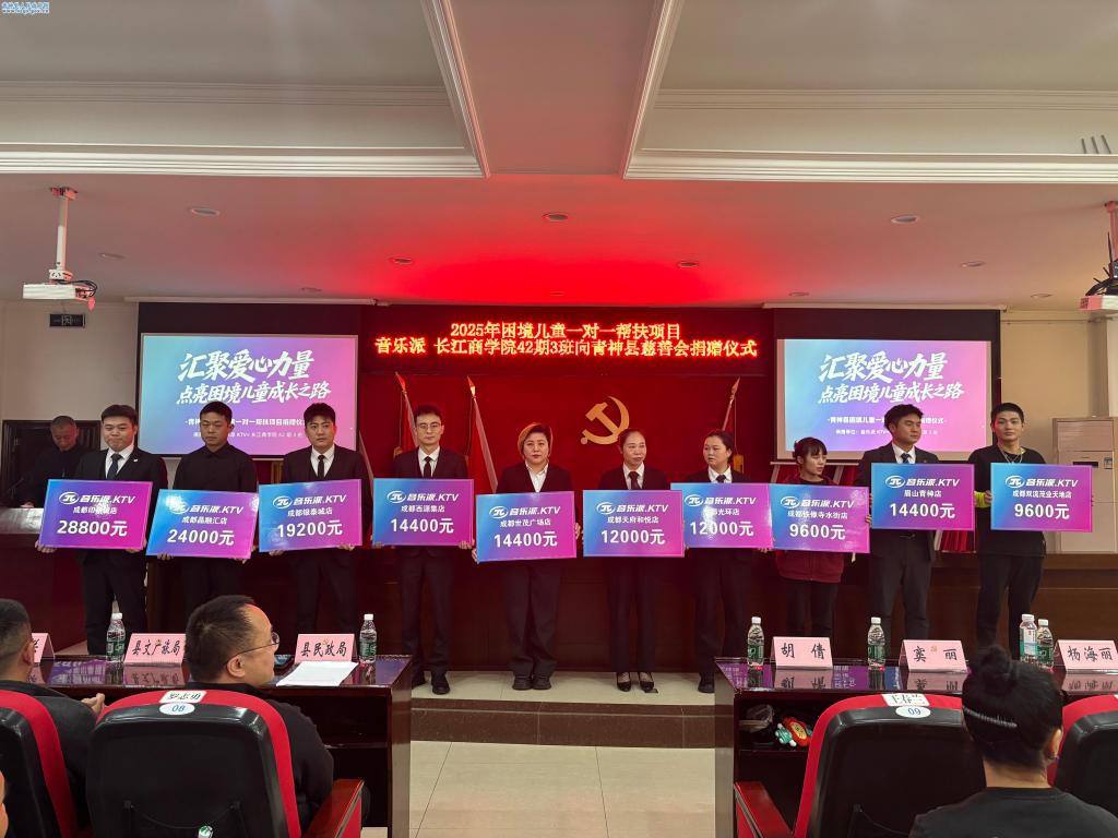 近日,青神县“困境儿童一对一帮扶”项目捐赠仪式在青竹街道办四楼会议室隆重举行。音乐派KTV、长江商学院42期3班慷慨解囊,向我县慈善会捐赠善款24万元,专项用于帮扶全县100名困境儿童家庭,以实际行动彰显社会责任,为困境儿童撑起一片爱的蓝天。