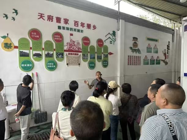 随后,考察团抵达仁寿县曹家镇,聚焦梨子产业发展取经问道。曹家镇作为“中国早熟梨之乡”,已形成集品种培育、规模种植、仓储物流、品牌营销于一体的完整产业体系。在梨子种植示范园,考察团看到连片的梨树枝繁叶茂,当地技术员详细介绍了“优选品种+科学管护+错峰上市”的发展策略——通过引进早熟、晚熟等多个优良品种,延长采摘周期;采用生态种植技术,提升梨子口感与品质;搭建线上线下融合销售平台,打响“曹家梨”区域公共品牌,“曹家梨膏”等产品远销全国各地。此外,曹家镇还通过举办梨花节、采果节等活动,以花为媒、以果会友,推动农文旅深度融合,让梨子产业成为乡村振兴的“支柱产业”。考察团成员纷纷表示,曹家镇在产业规模化、品牌化运营方面的经验极具借鉴意义。
