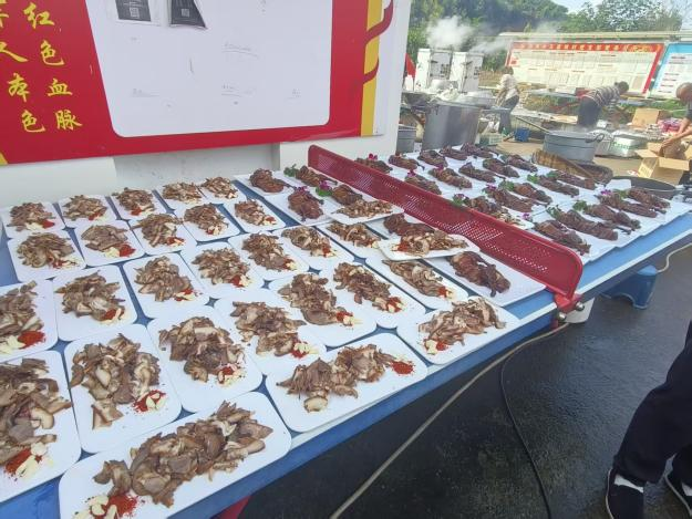 文艺演出落幕,热气腾腾的坝坝宴正式开席。餐桌整齐排列,志愿者们穿梭其间,将一道道充满家乡味道的家常菜肴端上桌。老人们围坐在一起,一边品尝可口饭菜,一边拉家常、话情谊,空气中弥漫着饭菜香气与邻里温情,尽显和谐氛围。