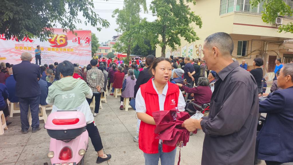 (向参与活动的群众发放民族团结主题纪念品)