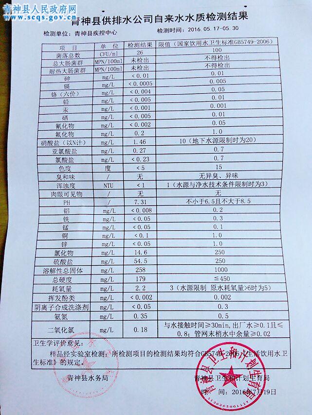 2016年青神县第二季度城市集中式饮用水水源地水质状况报告
